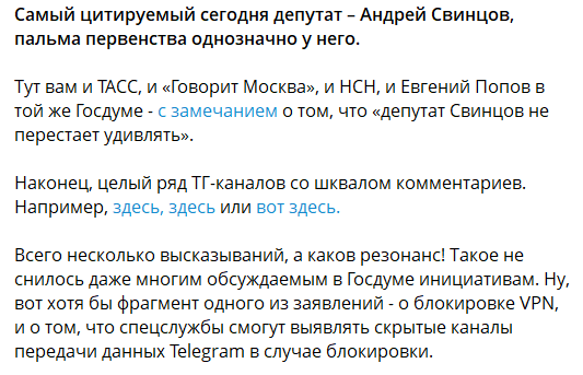 А что касается випиенов то не смеши мои тапки, депутат Свинцов. Россия не может жить с отключенным интернетом, такой х***ей даже в Иране не занимались. А если блэкаут не полный, то обойти запреты всегда возможно. Просто свободный интернет тогда превращается из базовой опции в элитный и недоступный большинству граждан продукт. И они начинают к нему яростно стремиться. Даже те, кто сидел бы в Одноклассниках и кому эти ваши телеграмы нах**, в общемто, не нужны. Но раз запрещают, значит во-первых п******ы, а во-вторых — надо запрещенку добыть. Общество тогда просто валится в терминальный внутренний конфликт. Который разрешит Илон Маск, как Прометей подарив россиянам безлимитный не блокируемый спутниковый интернет. Ну и гдето в этот момент и нам и вам придет окончательный п***ец, запрещаторы х***ы. Будем на соседних столбах с тобой висеть, депутат Свинцов. Я буду висеть как военный преступник. А ты — просто как придворный долб***)