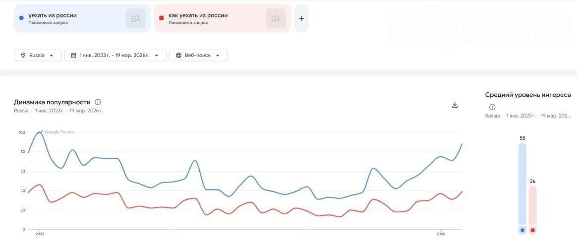 И это очень плохие показатели. Потомушта ещё год назад гуглили в сто раз меньше. Но это не «88% от времен мобилизации в 2022». Этот тезис является сознательной манипуляцией. Чтоб человек увидел график подковой, прочитал про мобку и о***л, не вникая. А потом пошел думать тяжелые мысли о том, что всё летит в п***у, раз уже 2022 почти догнали.