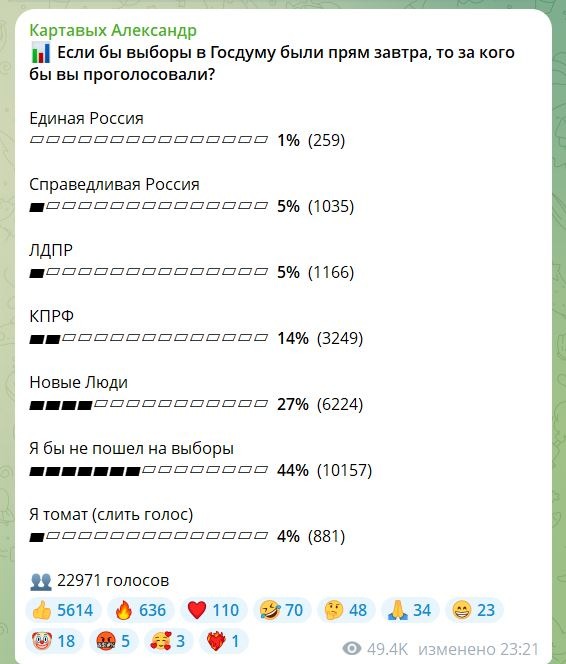 Вообще, реальный рейтинг даже на моем канале у ЕдРа не такой печальный, как в нашем самом честном опросе (t.me/AlexCarrier/15419). Не 1%, а гдет в районе 15-20%, я полагаю. Просто вы людей запарили своими заливами, вот они на вас и отрываются. Но потом задумаются над остальными партиями и поймут, что там тоже всё очень вяло и не интересно. А Новые Люди это чисто протестная голосовалка против долбо***ких ограничений, такто они популисты и не то чтобы ктото там во чтото особо верил. Да и не совсем это выборы, осенью, это скорее этакий большой соцопрос, потомушта партийные списки и вот это вот всё.