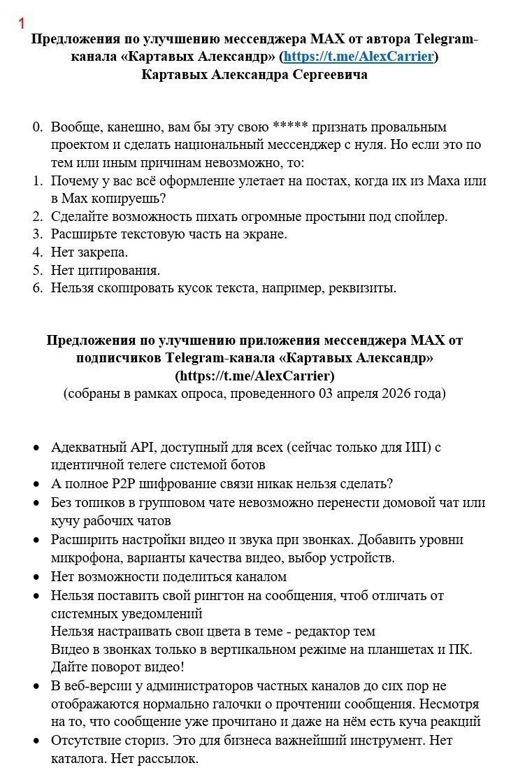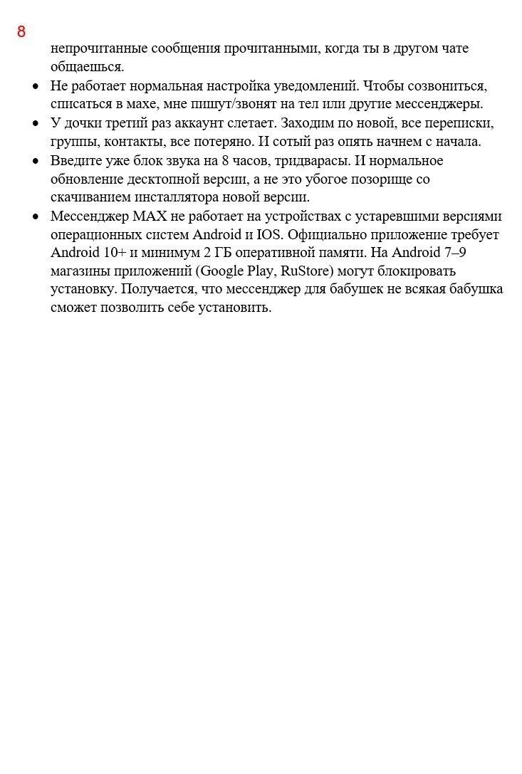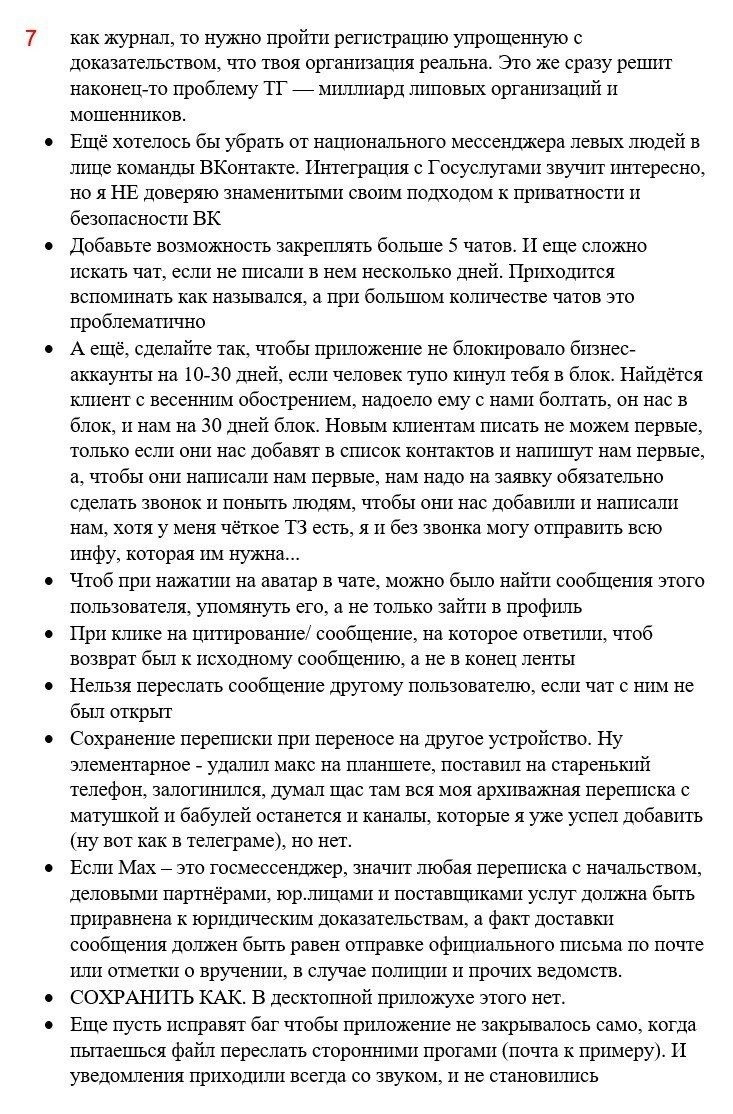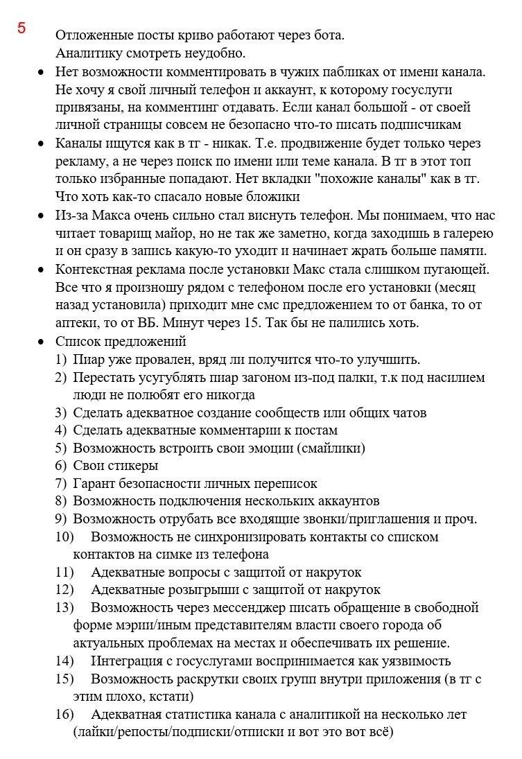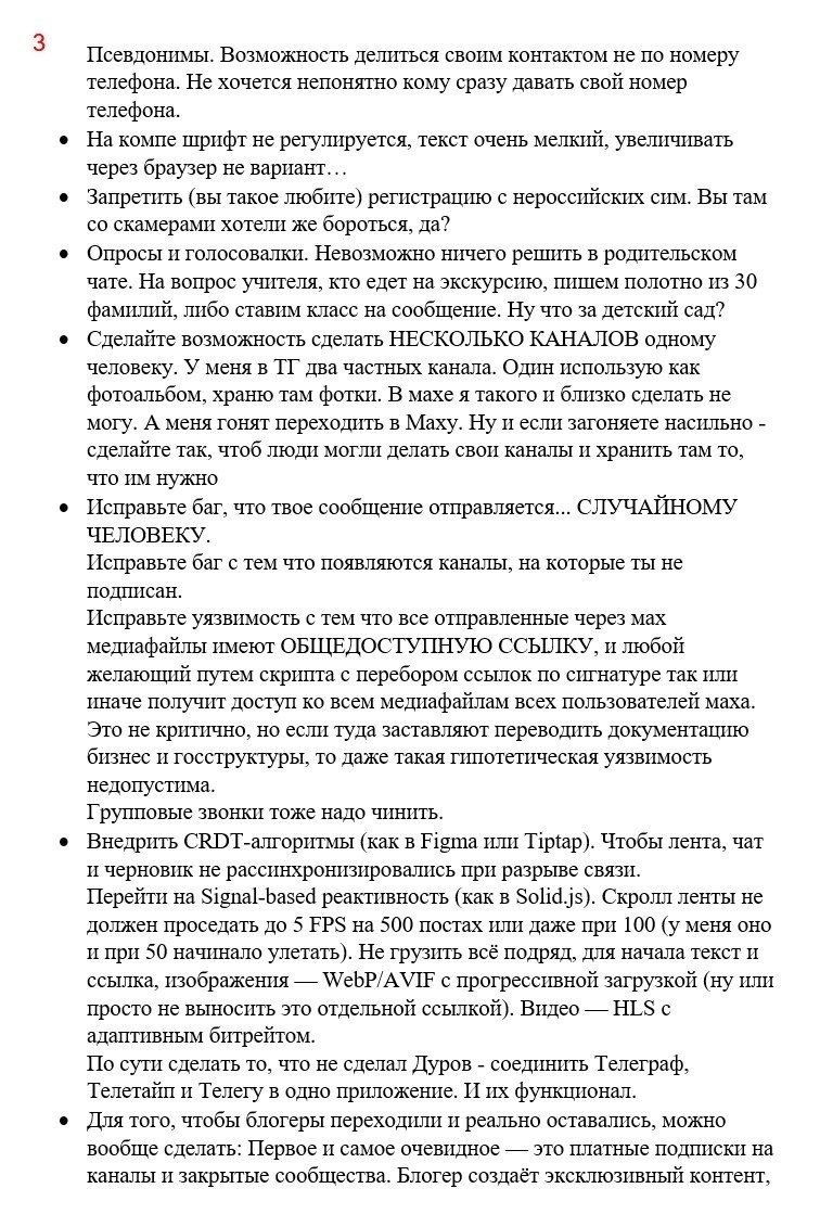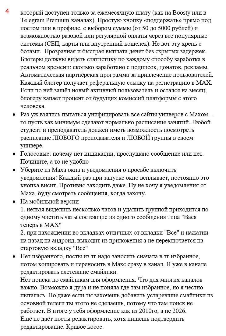 Предложение по улучшению национального мессенджера Мах. Ну, тоесть там плохо и халтурно буквально всё и есть ощущение, что эту х***ю в принципе никто не тестировал и не оптимизировал. Мы даже не уверены, что она разработана для людей. Поэтому я всё-таки настаиваю на том, что эту х***ту лучше просто прикрыть и начать заново. Точнее, перестать держать её на плаву админресурсом и оно само утонет примерно за неделю. Тем более в продвижении мессенджера допущены чудовищные косяки и с минусовой репутацией такого уровня проще былоб ребутнуть разработку, даже еслиб приложуха была относительно неплоха. Но, как очевидно следует из текста выше, она ещё и сырая чуть менее, чем целиком. У разработчиков была простейшая задача скопировать функционал Телеграма и ВК и он с ней не справился даже близко, накосячив где только возможно.