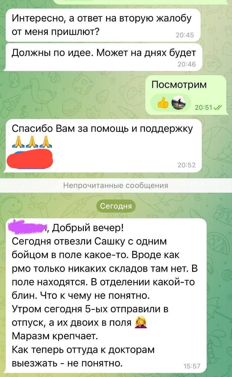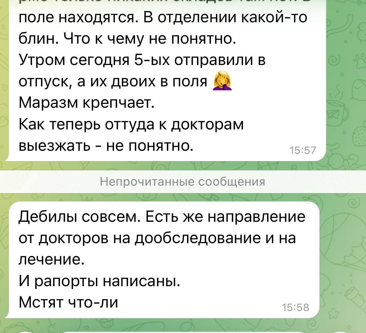 4.Теперь его вообще вывезли в поля вместо отпуска и вместо лечения, спасибо, е***, за заботу!