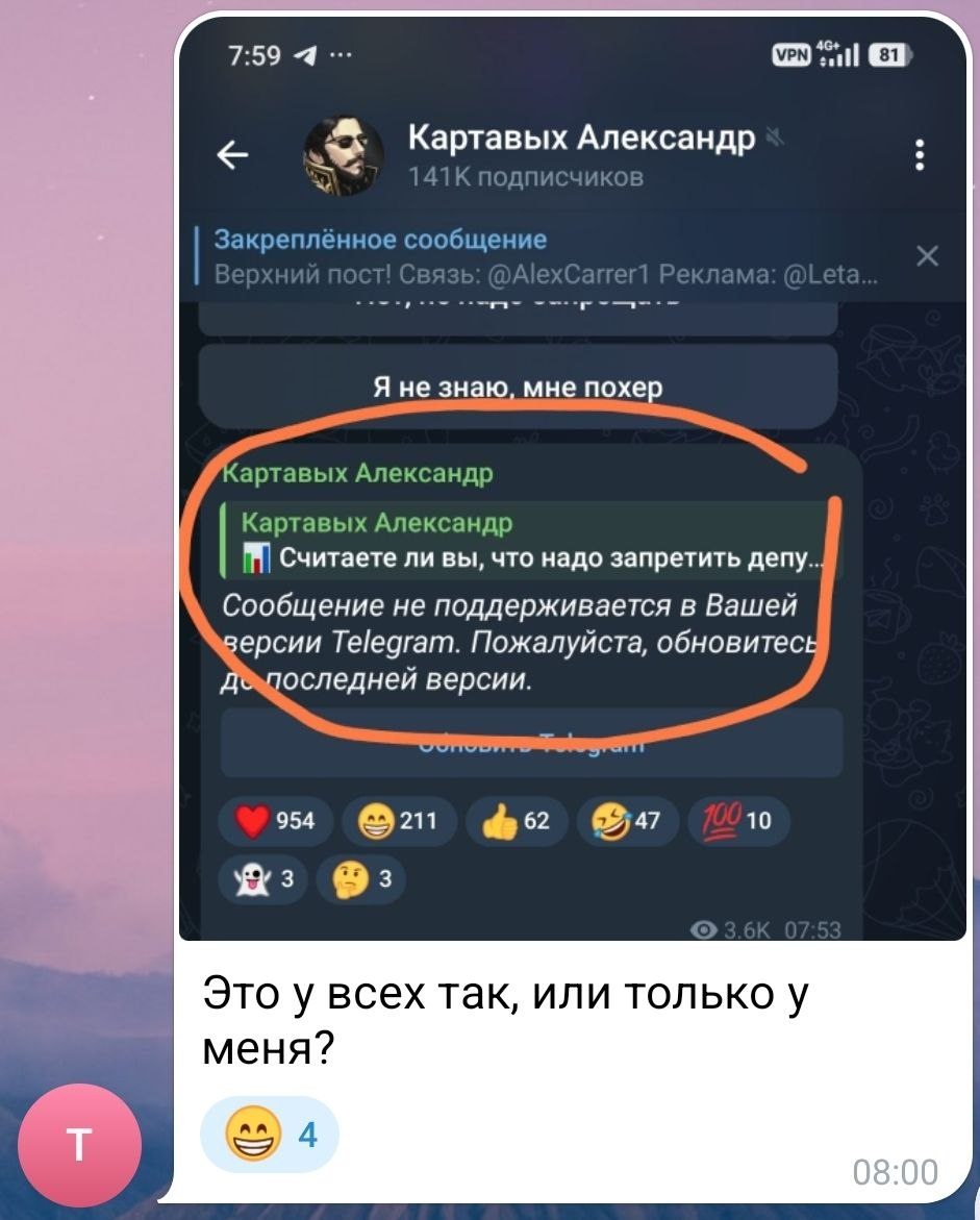 Кстати, может и не зальют. Ботам редко обновляют ТГ, только тогда, когда они на старых версиях теряют возможность исполнять свои функции. В данном случае для старых версий запретили участие в опросах. Крч, рубрика «Эксперименты!» продолжается.