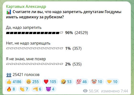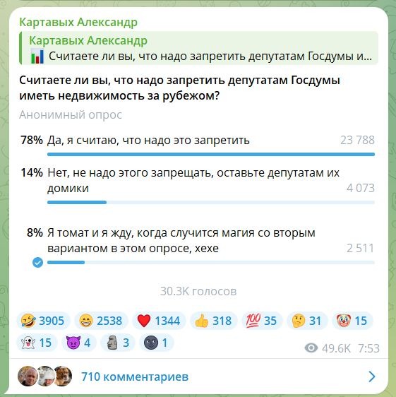 А хотите по настоящему пое****ся навести социальной справедливости? Уберите оттуда чиновников и региональных депутатов, оставьте только депутатов Госдумы. И, внезапно, против выступят только те депутаты ГД, которые имеют недвижку за рубежом. А их не так много и против них весь остальной аппарат, население, логика и здравый смысл. Плюс сразу отсекаются те депутаты, которые в девятый созыв не пойдут. Они щас примут и спокойно свалят себе, вообщеж кайф. И таких будет довольно много, потомушта текущая Дума ещё довоенная, её будут перетряхивать.