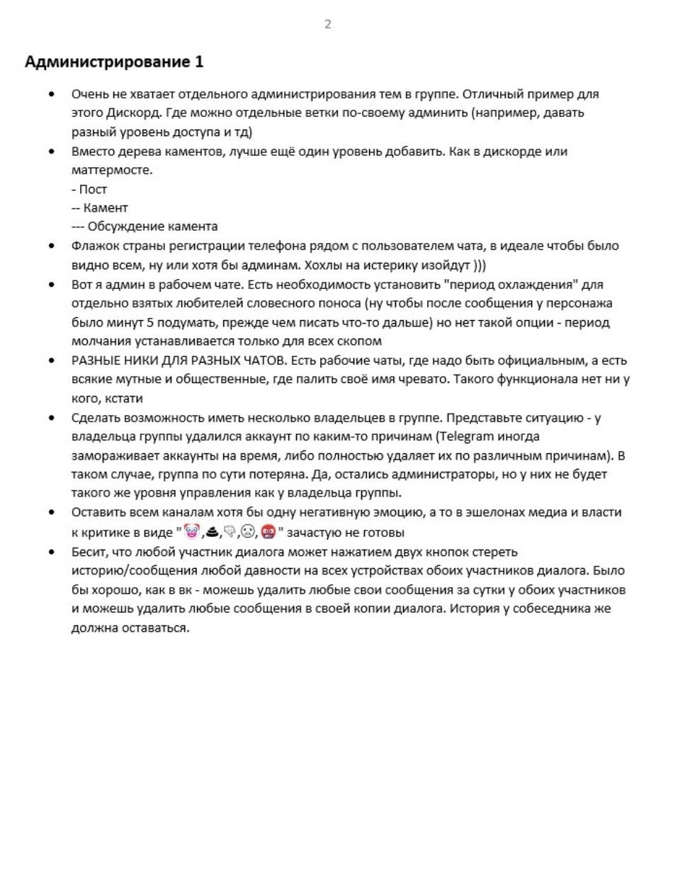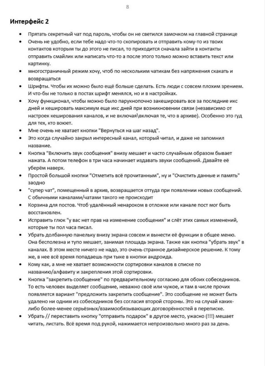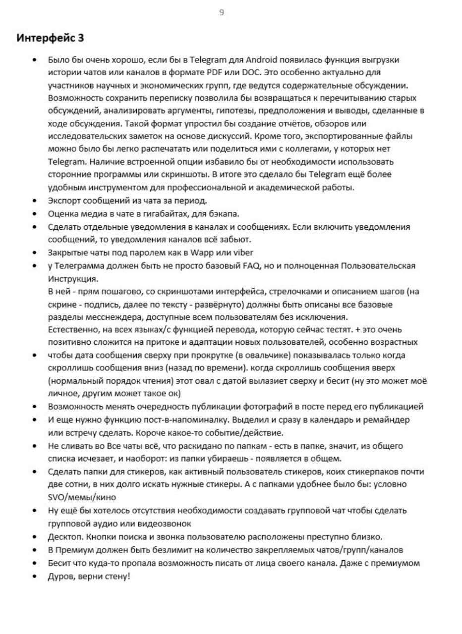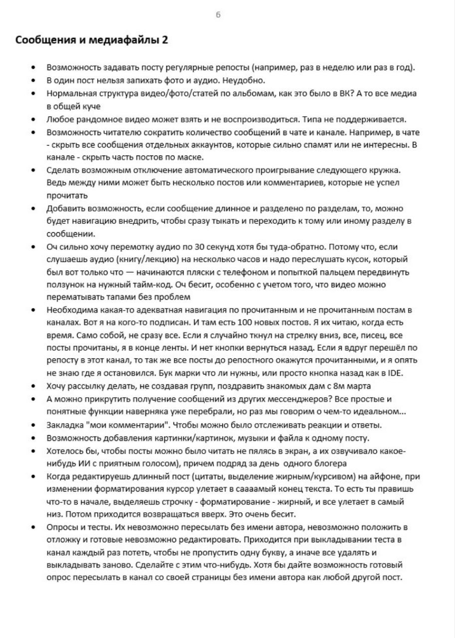 1. Нужно сделать нормальное обучение функционалу Телеги, причем встроенное в саму ТГ. Где ясно-понятно, очень ДЛЯ ВСЕХ, расписать сначала основной функционал соцсети, а потом и всякие приколюхи для продвинутых пользователей. Не знаю как лучше это сделать, но надо. Чтоб Телега сама тебя обучила собой пользоваться, причем не выходя из самой Телеги и чтоб это не были какието душные уроки. В общем, антиинтуитивность многих вещей из чегото модного и прикольного (мол, «не для всех») превращается в ошибку, и надо бы это исправить.