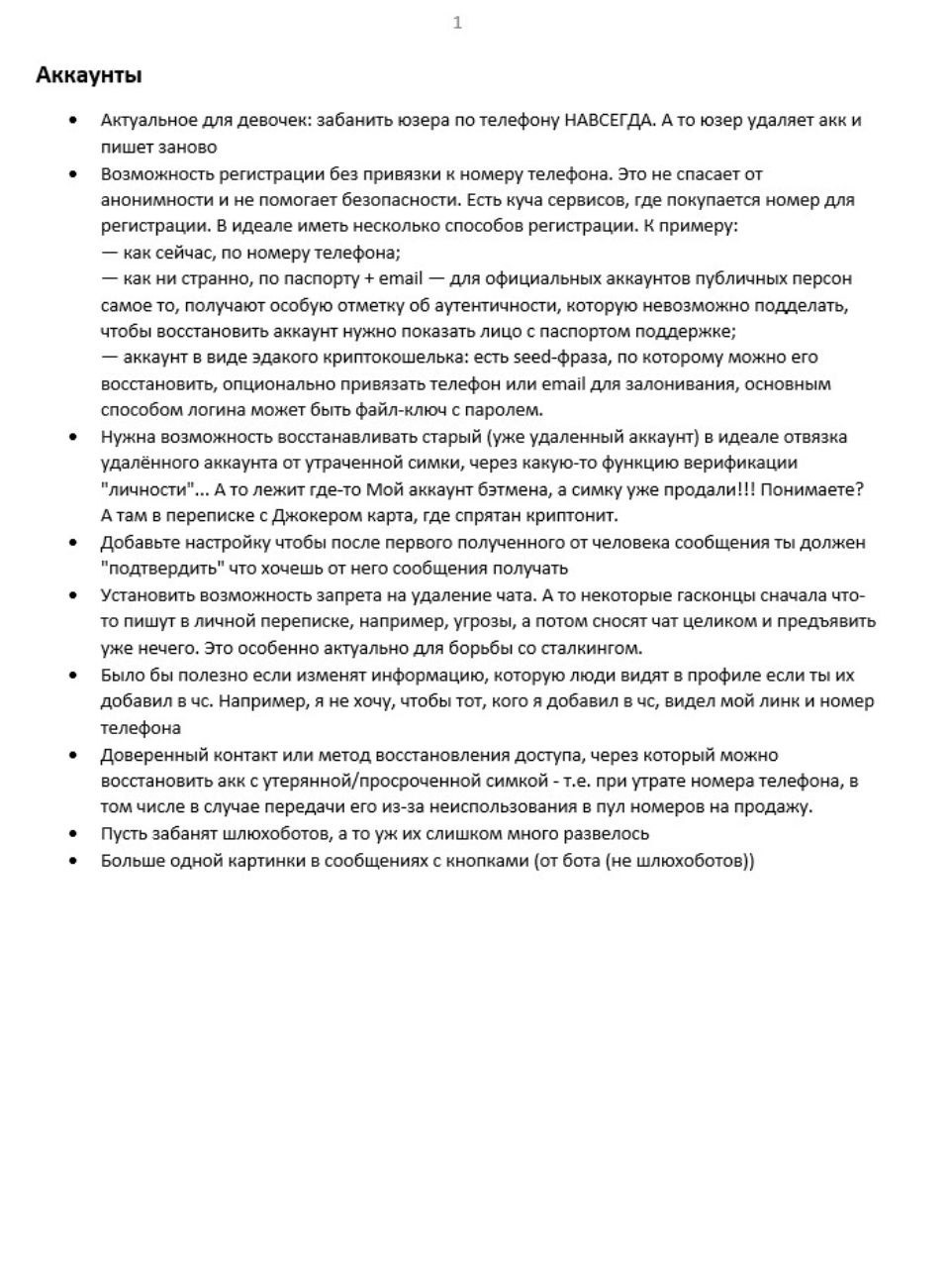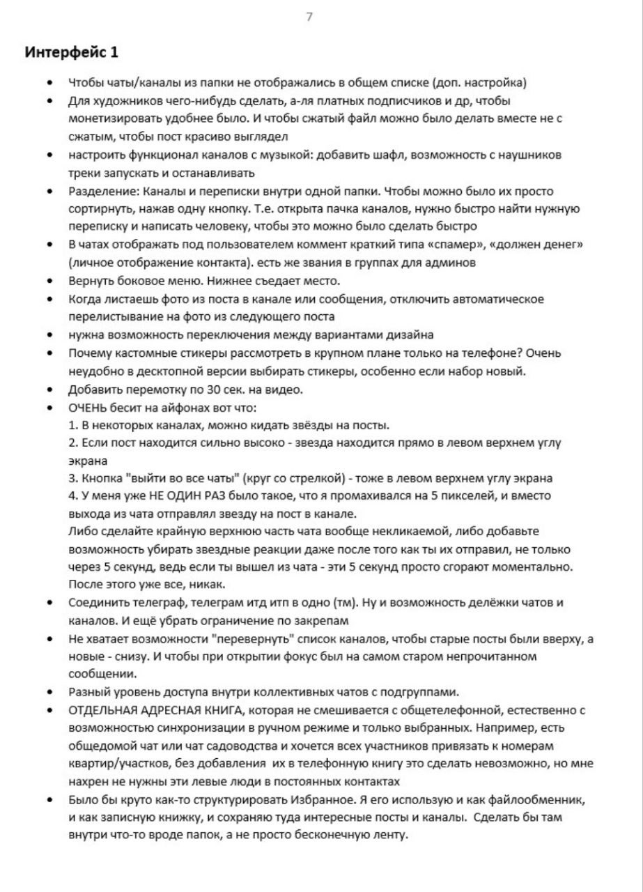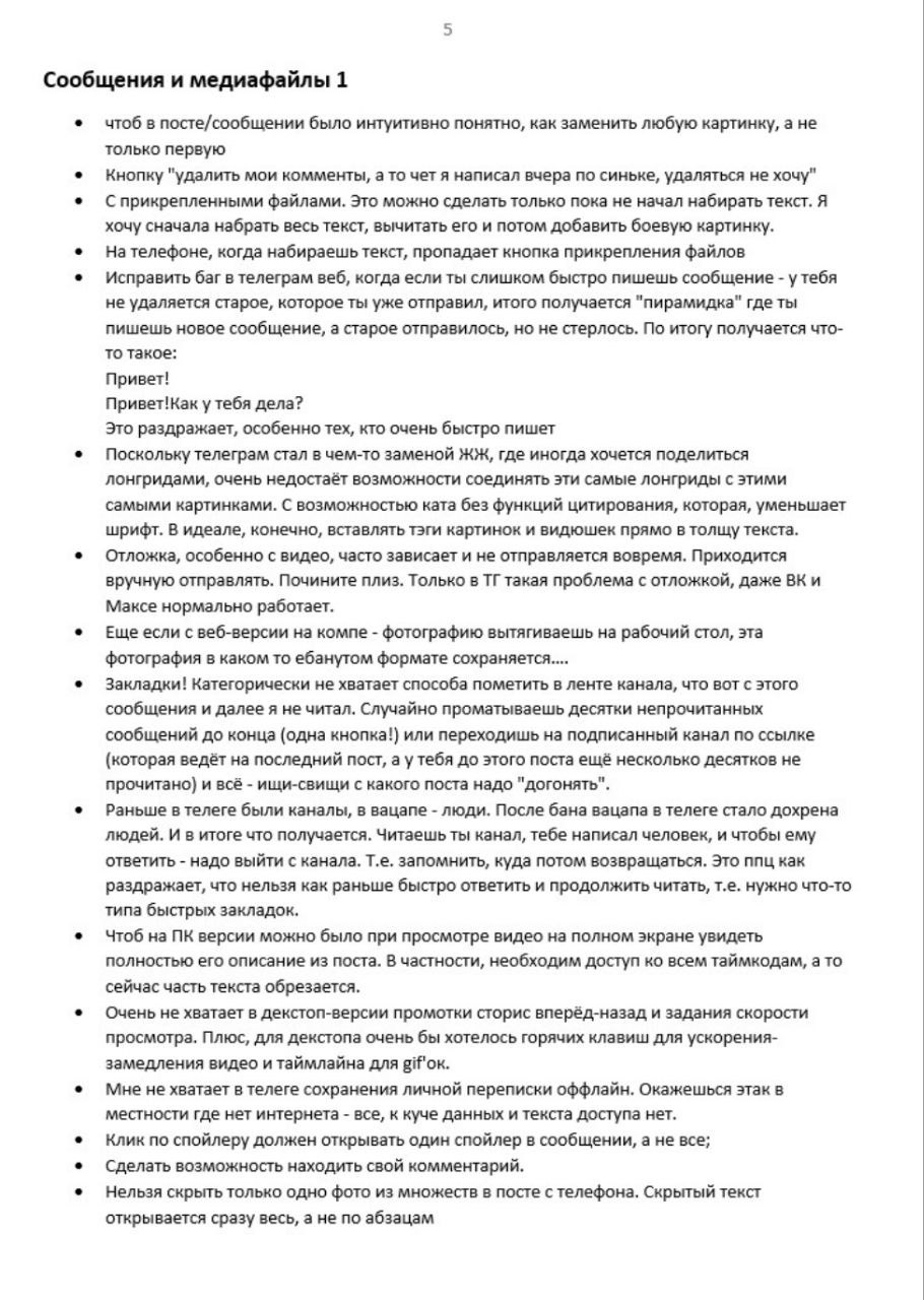 Вчера я попросил читателей накидать идей о том, чего в ТГ следует улучшить. И читатели накидали, на почти 1к комментов, почитать целиком можно тут (t.me/AlexCarrier/15510). Я же отобрал ~120 самых толковых с моей точки зрения предложений и разбил их по тематике. В итоге вышел годный вишлист того, чего пользователи ожидают от родного мессенджера, чтоб и дальше насиловать себе мозг обходами блокировок. Не всё из этого реалистично и стоит внедрения, но есть и прям то, что ничего не будет стоить по усилиям, но кратно улучшит юзер-экспириенст. Разработчики Маха могут подглядывать, я не против, большая часть фичей сработает и у них.
