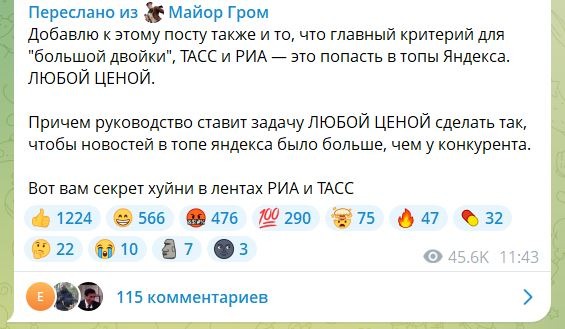 РИА Новости в последнее время толи обстановку качают, толи упоминаемость фармят, толи просто косят под долбо***в. Но такого довольно много. Громкий заголовок, моментальное засирание нарративом всей медийки со ссылкой на уважаемую интернет-газету, а потом скромненькое