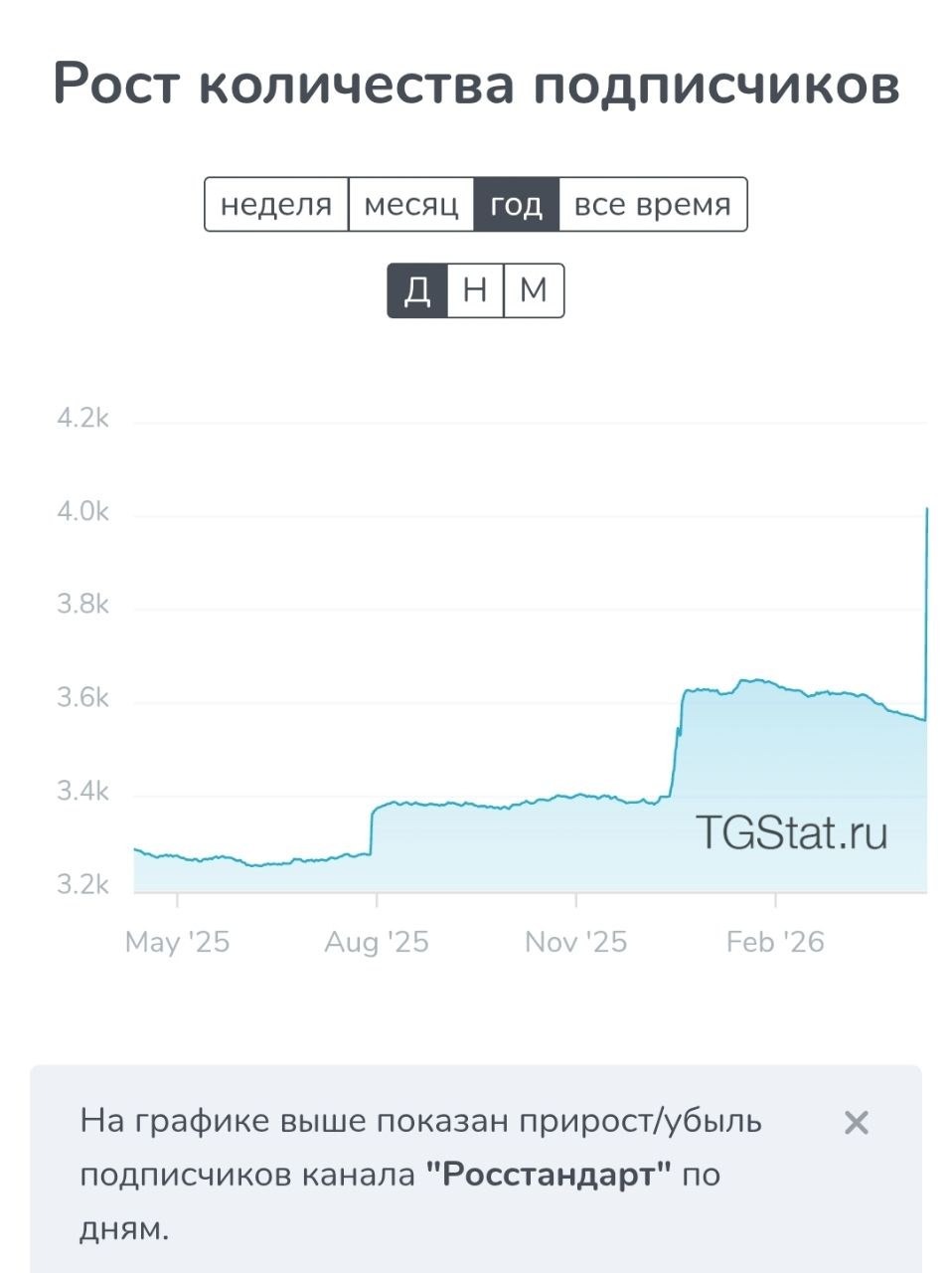 Ну что, первые результаты ночного перфоманса. Возьмем, например, канал Росстандарта (@rosstandart), просто потому, что он регулярно ведется, но практически статичен по активности. Собственно, на нем вообще не колебалась подписота, пока я его не упомянул. А потом сразу десантировалось 500 человек, вот админ удивится.