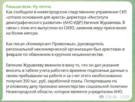 Вот что демографические показатели животворящие делают, целого директора «Института Демографического Развития» из СИЗО отпустили) Надеюсь, что это совпадение.