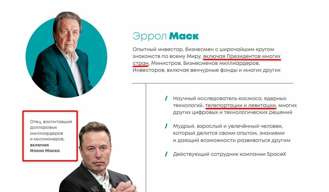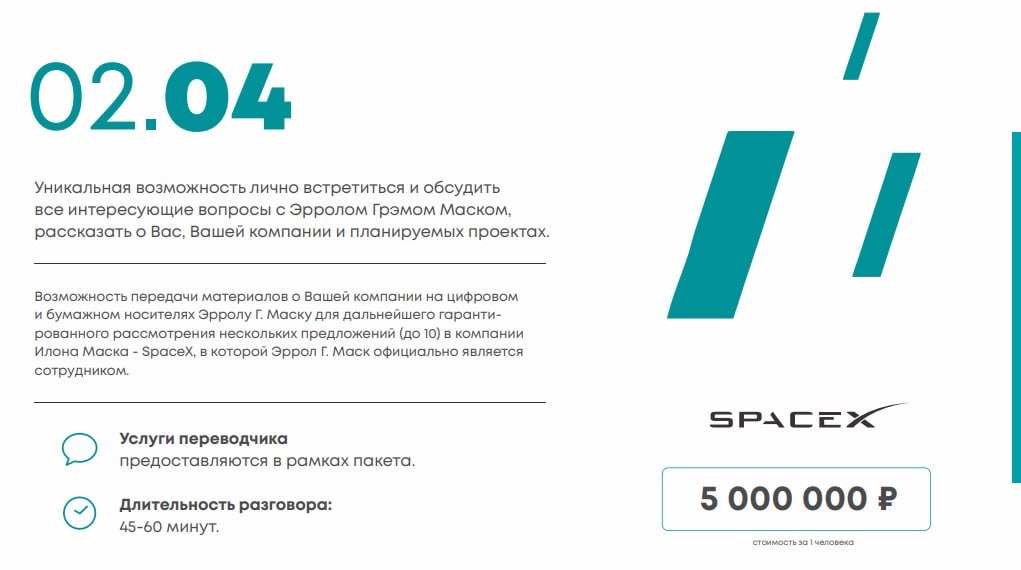 Ну и, канешно, на первой пикче удивительное описание американского деда. Он занимается бизнес-проектами в сфере, внимание, ПУТЕШЕСТВИЙ ВО ВРЕМЕНИ и ТЕЛЕПОРТАЦИИ. Ну, тоесть, это не з***па конская, а не имеющие аналогов технологии, понимать надо. Также через деда предлагали за деньги передать письмо Илону Маску (который ненавидит своего отца, я напомню). Ну и в випке можно было за 5 миллионов час поп***еть о том о сем и тоже передать до десяти писем в СпейсХ, которыми там подотрут ж**.