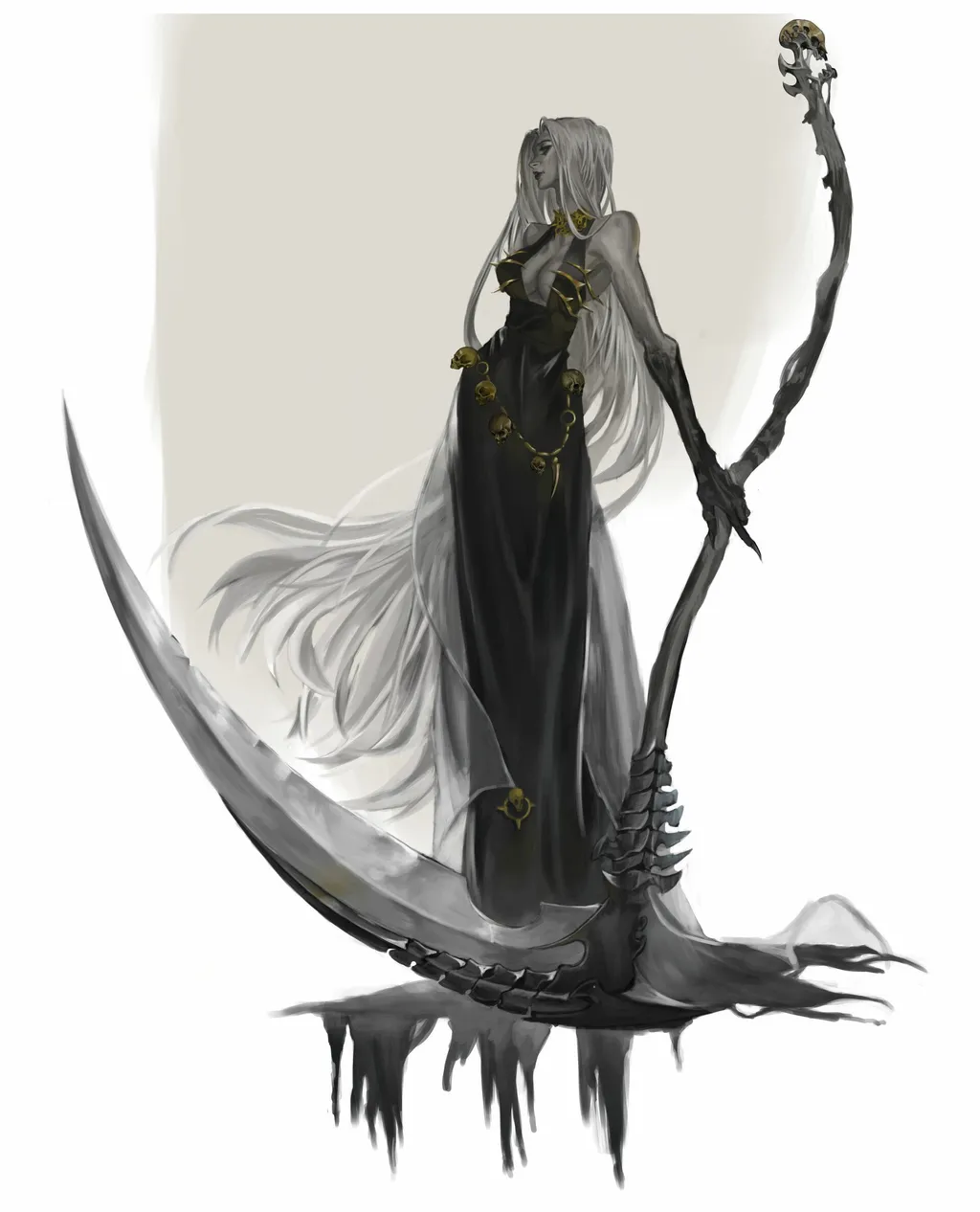 Произнеся эти слова я почувствовал как нечто обратило на меня своё внимание, а в следующую секунду передо мной из воздуха вышла женская фигура с серебряными волосами до пола, она была одета в чёрное платье, в виде пояса выступала цепочка с черепами, в руках у неё была страшного вида коса.