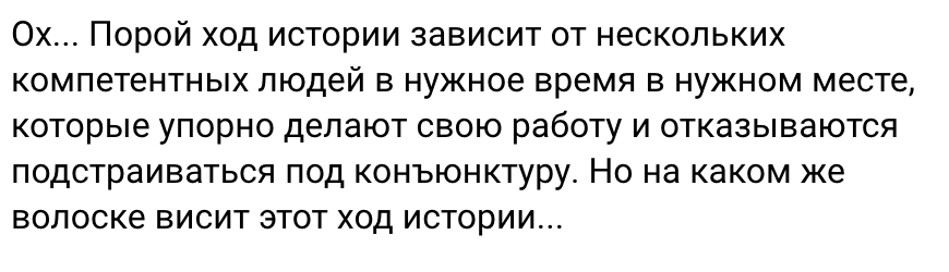 Ход истории зависит от больших процессов, огромных «волн», если угодно. Экономических, технологических, социальных. Отдельные личности могут лишь «оседлать» волну и сделать некоторый вклад. Никакие люди «в нужное время в нужном месте» историю радикально не меняют. Как бы не хотелось так думать «борцам с системой».