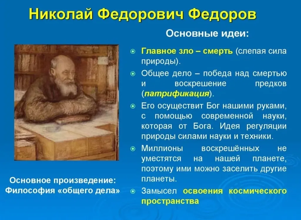 Примерно так мы бы могли пересказать основные идеи великого, и, к сожалению (есть на то исторические причины) малоизвестного русского мыслителя Николая Федорова. Которые, если найдут своего «великого практика», сопоставимого по уму, воле и организаторским способностям с Ильичем, способны дать человечеству новый импульс для уверенного движения вперед.