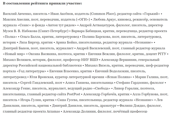 В составе экспертов — сами авторы книг, входящих в рейтинг, естественно. На первых местах — лауреаты Большой книги, Букера и аналогов.