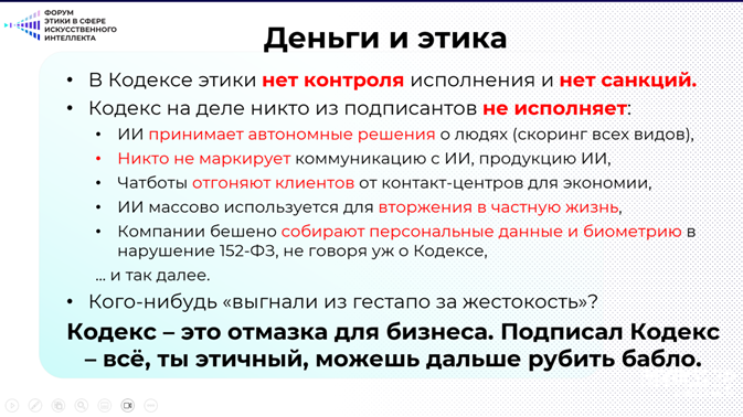 Этим должны заниматься те, кто вырабатывает этику. Коллеги — молодцы! Наш российский вклад в этику ИИ — уникален. Нужно насыщать технологии ИИ-этикой, плечом к плечу с практиками, учёными. Сохранить этическую политику и повестку.
