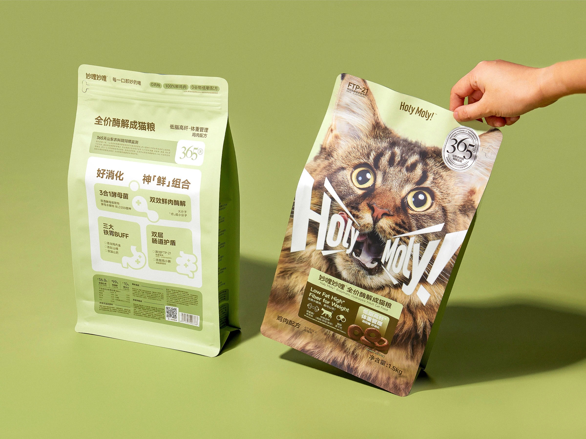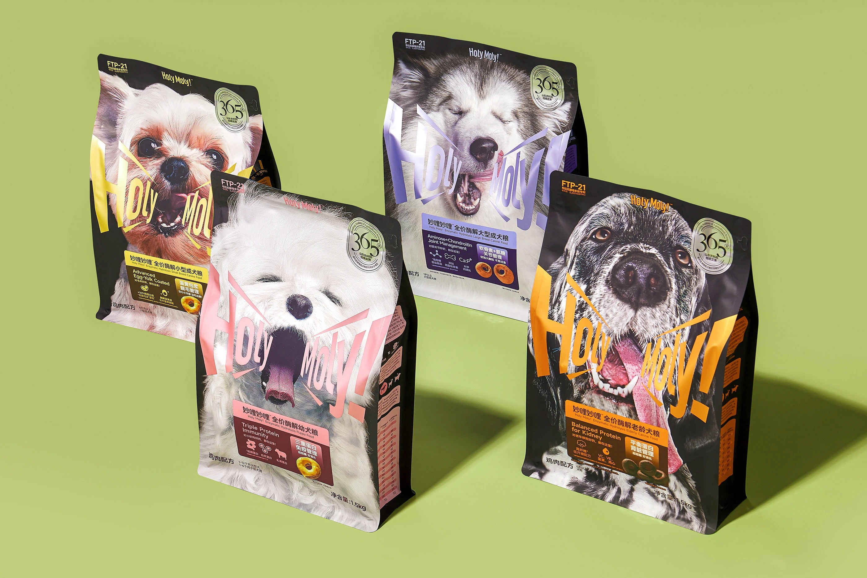 У DXD есть разные проекты, но больше всего у них упаковки товаров для домашних питомцев — больше 100 для 20 разных брендов. Их работы очень коммерческие: приятные глазу, понятные, яркие. Дизайнеры хорошо работают и с фотографией, и с плоской графикой. Всё здорово с цветом и иерархией элементов — сразу считывается, что главное, что второстепенное, где продающие акценты. Они умеют работать со смыслами и вызывать эмоцию. Например, дизайнеры соединили два иероглифа 毛兀 (название бренда, по-английски MAOWOO) в кошачью морду. По этому кейсу я их и заприметила. Он эмоциональный и яркий, хотя сама упаковка минималистичная. Кричащие животные с Holy Moly! тоже вызывают эмоциональный отклик. Дизайнеры DXD говорят, что нацелены на молодую аудиторию, как и их клиенты, поэтому с удовольствием используют юмор в работе.