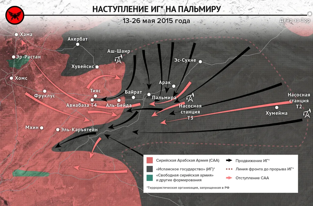 Уже весной 2015 года боевики «Исламского государства» занимают значительные территории в Центральной Сирии, сжимая кольцо вокруг Пальмиры и ее газовых полей. Северной стенкой пальмирского «кармана» стал округ Акербат на востоке Хамы: благодаря горному массиву населенный пункт Акербат и прилегающие к нему территории превратились в сложный укрепрайон, в котором были сосредоточены до нескольких тысяч боевиков. К югу от Пальмиры террористы атаковали фосфатные месторождения Хнейфиса. 20 мая 2015 года ИГ сумело продвинуться в Пальмиру с севера и северо-востока и занять треть города. Атаки боевиков в остальных секторах обороны были остановлены, однако прибывшее подкрепление ИГ в размере 800 боевиков довершило прорыв в город. 21 мая террористы вошли в археологический комплекс Пальмиры, а уже к 26 мая линия фронта сместилась в район Фруклуса, Эль-Каръятейна и Тияса.