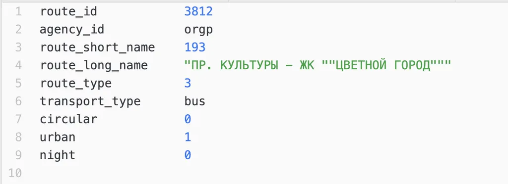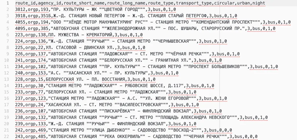 Следующий после остановок файл который разумно изучить это маршруты (routes.txt), так он выглядит:
