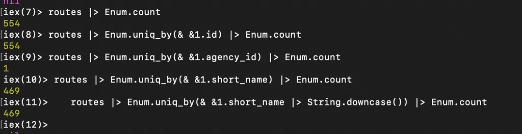 5 – route_long_name не везде уникален (526 уникальных из 554), приведение к регистру создает еще один дубль (становиться 525 уникальных из 554)