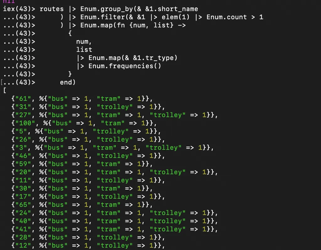 Сначала для каждого неуникального номера маршрута нужно получить объект с частотой видов транспорта: