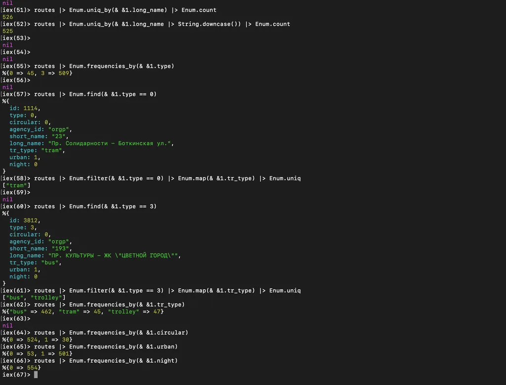 значит route_type это мусор (зная transport_type всегда можно получить route_type), автобусных маршрутов – 462, троллейбусных – 47, трамвайных – 45. Интересно что трамвайных маршрутов всего на два меньше троллейбусных, хотя остановок было меньше на 457. Пока выглядит как аномалия, но связь между остановками и маршрутами будет дальше.