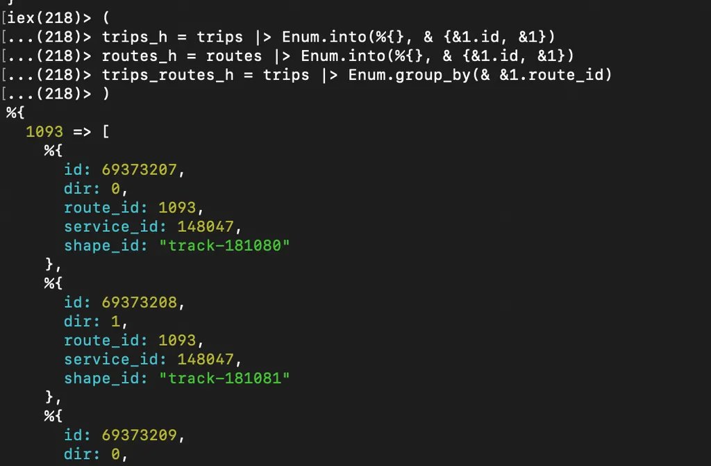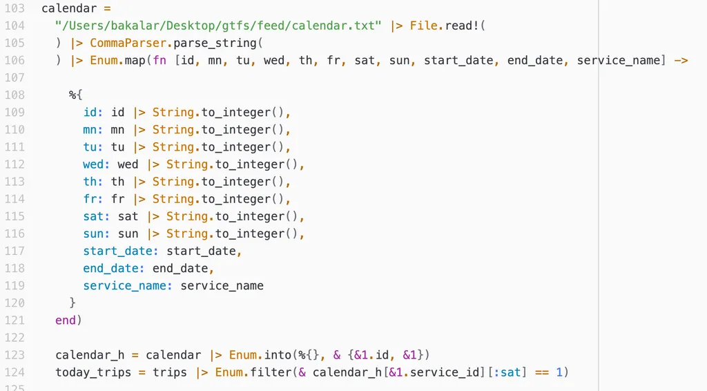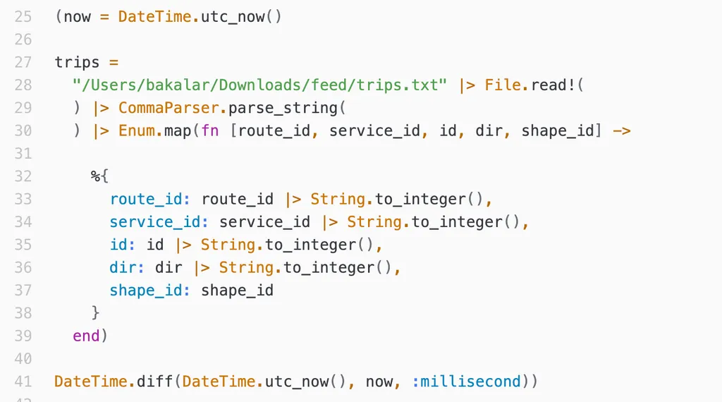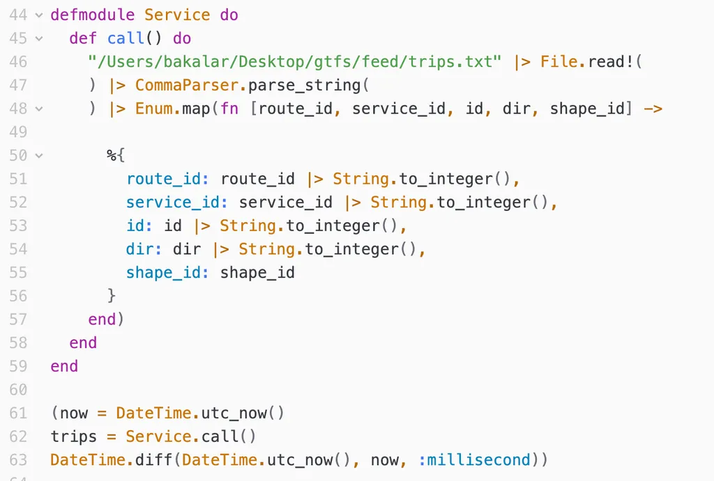 тут стоит учесть что файл маршрутов весил 64Кб, а файл рейсов 4.5Мб (в 72 раза больше). Если засечь время записи в память (чтение +парсинг) то получим примерно 500мс для рейсов, и 10 мс для маршрутов. Самый большой файл (stoptimes.txt –185Мб) нас ждет впереди, но уже сейчас можно кое-что улучшить. Например написать код для чтения рейсов как функцию внутри модуля, скомпилировать его, и вызывать чтение через эту функцию: