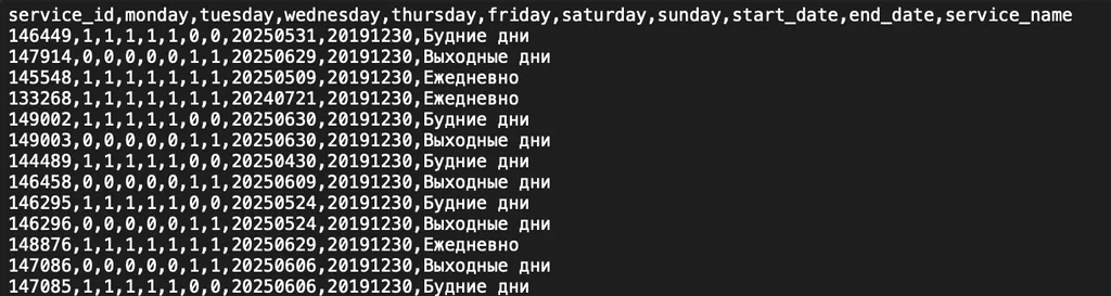 Отсюда можно узнать что exception_type в calendar_dates это возможность поменять для конкретной даты один service_id на другой. Дата фида (5 июля 2025) в этом файле не встречается, поэтому файл не представляет интереса.