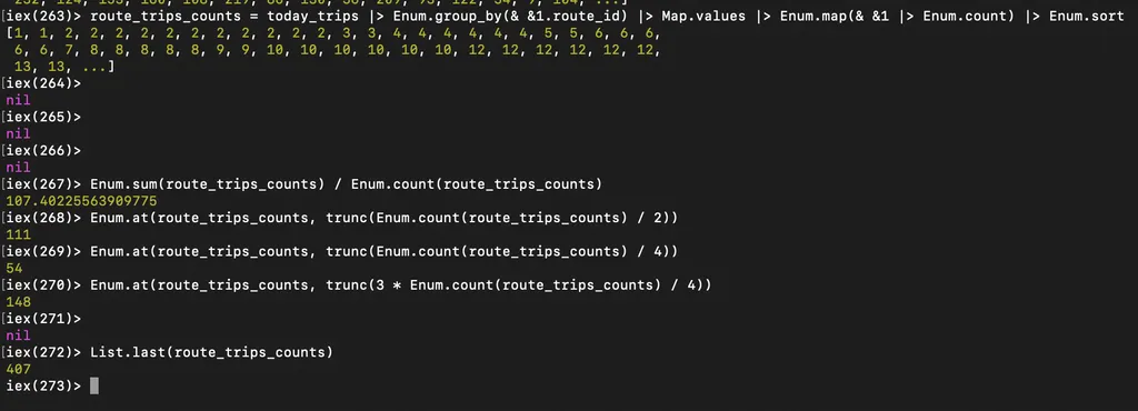 В среднем – 107 рейсов на маршрут, медиана – 111, половина маршрутов имеет от 54 до 148 рейсов (квартильный размах), максимум у какого-то маршрута 407 рейсов в день (примерно каждые шесть минут).
