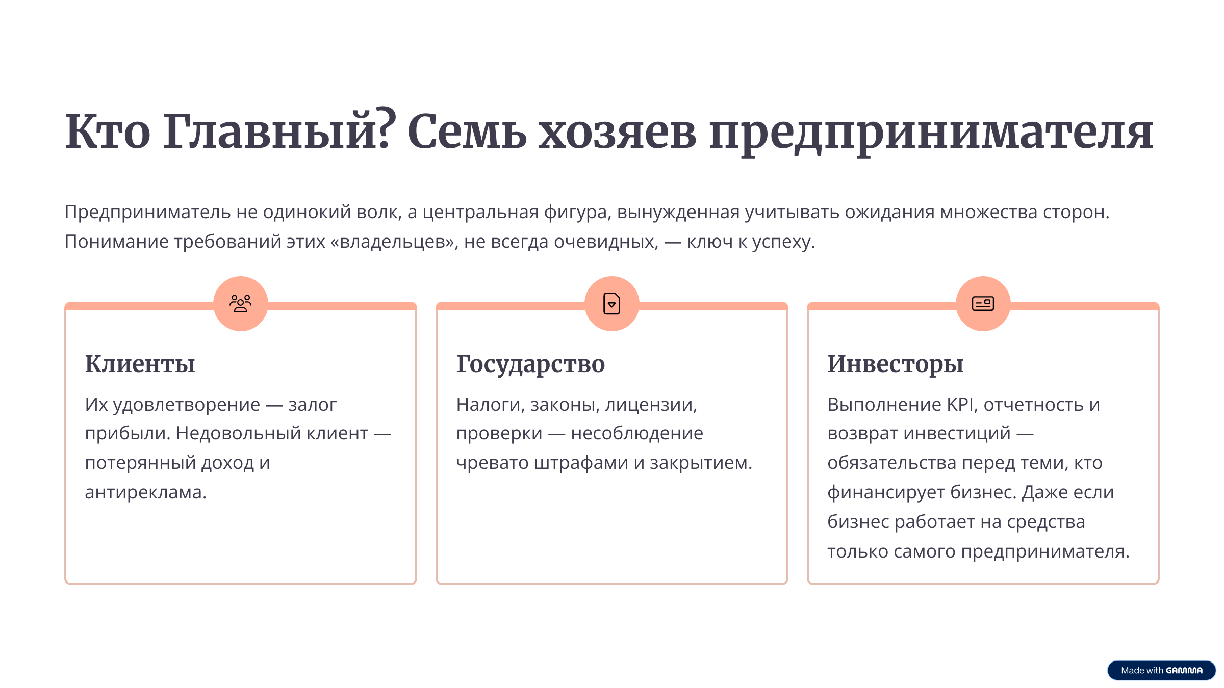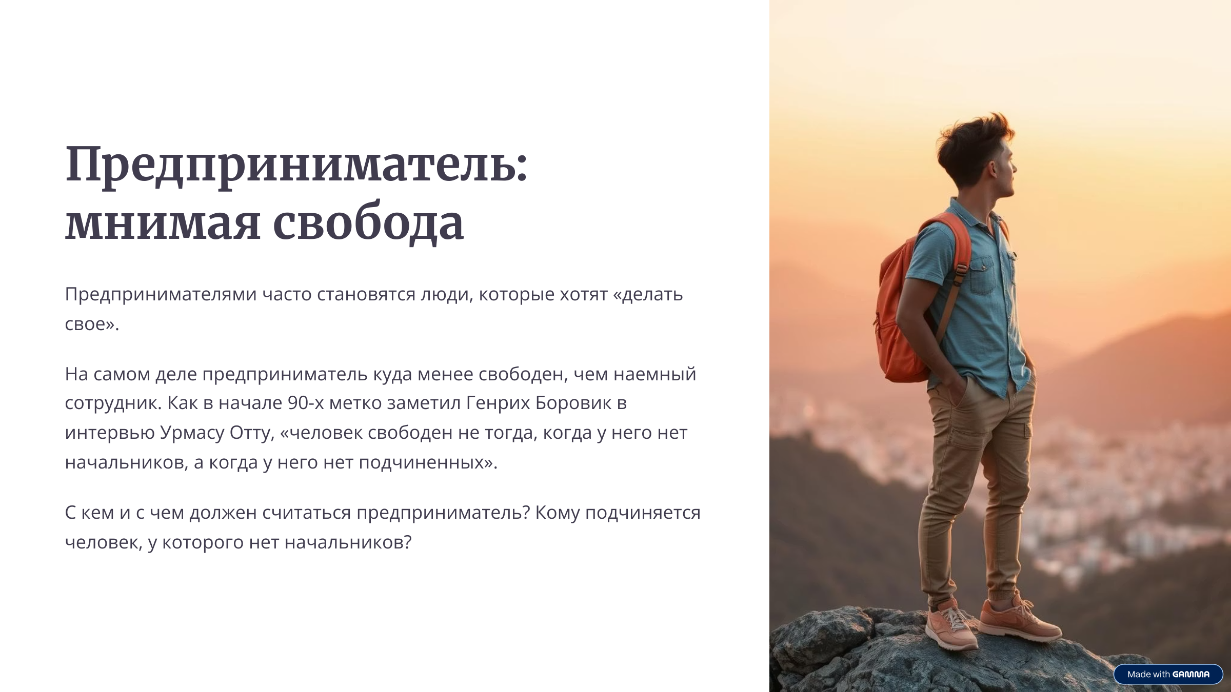 Не раз и не два встречались предприниматели, которые начинали бизнес потому, что «не хотели никому подчиняться». Но на самом деле предприниматель — одна из самых несвободных ролей в мире. У него нет начальников в штатном расписании, но его начальники куда строже и несговорчивей.