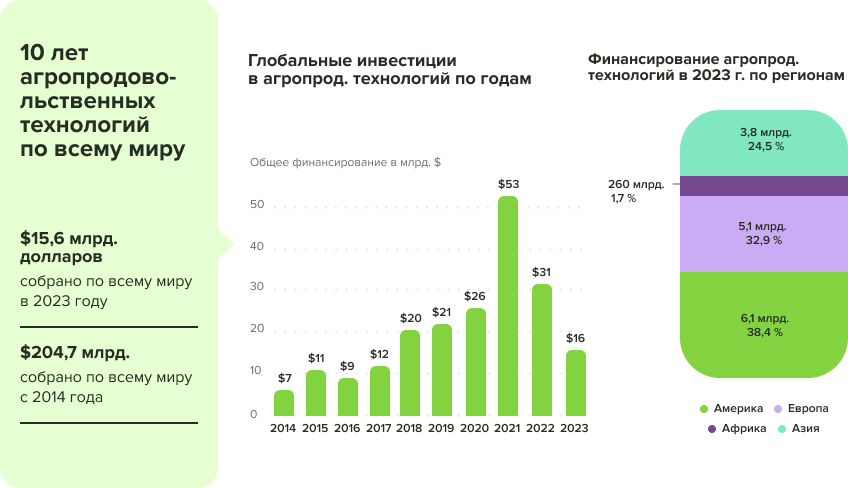В отчёте AgFunder за 2024 год отмечено: «Несмотря на общую коррекцию на венчурном рынке, AgriTech продемонстрировал большую устойчивость — интерес к нему сохраняется со стороны стратегических инвесторов и корпоративных фондов.»