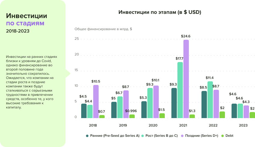 Второй график иллюстрирует на каких стадиях развития компаний концентрировались инвестиции в разные годы. В 2023 году объёмы финансирования на ранней, основной и поздней стадиях практически сравнялись, что может свидетельствовать о более сбалансированном и осторожном подходе инвесторов.