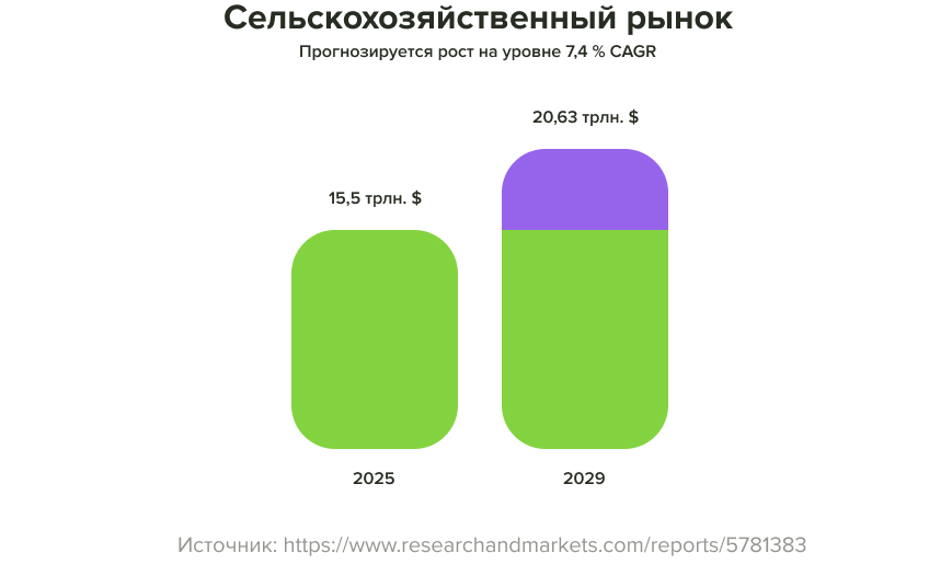 Согласно прогнозу, объём мирового рынка сельского хозяйства увеличится с 15,5 трлн долларов США в 2025 году до 20,63 трлн долларов США к 2029 году, что соответствует среднегодовому темпу роста (CAGR) 7,4%.