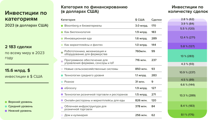 Суммарно было заключено 2 183 сделки на общую сумму $15,6 млрд. Больше всего средств привлекли категории, связанные с биоматериалами, агробиотехнологиями и электронной торговлей продуктами (eGrocery), тогда как наибольшее число сделок пришлось на сегменты «Инновационная еда» и «Средние звенья цепочки поставок» (логистика, переработка и т. д.).