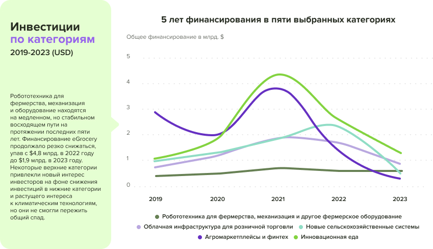 Ниже видно как менялся объём инвестиций в ключевые категории AgriFoodTech за пять лет (с 2019 по 2023 год). Несмотря на общий спад инвестиций в индустрии, ряд категорий выделяются положительной динамикой: Farm Robotics, Mechanization & Equipment — категория устойчиво растёт, отражая повышенный интерес к автоматизации и агро-IoT.