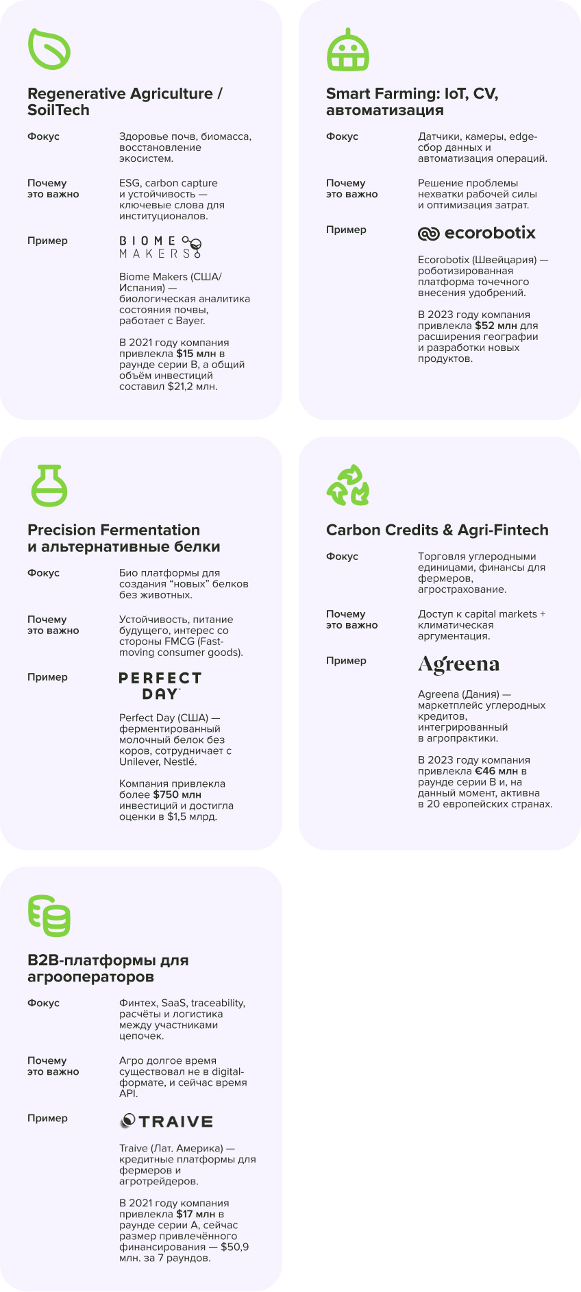 Эти цифры подчёркивают устойчивый, реальный спрос и долгосрочные тренды (продовольственная безопасность, климат, энергия), что делает AgriTech одним из немногих секторов, где технологии могут масштабироваться и приносить реальную доходность.