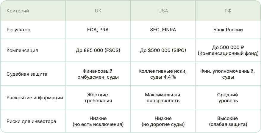 Законодательство (например, Securities Act 1933, Dodd-Frank Act) требует максимальной прозрачности от компаний, а SIPC страхует счета инвесторов до $500 000. В Великобритании регулятор FCA также предъявляет высокие требования к раскрытию информации и борьбе с манипуляциями, а компенсационный фонд FSCS покрывает потери до £85 000. Однако после Brexit британская система может столкнуться с изменениями, особенно в части доступа к европейским механизмам защиты.