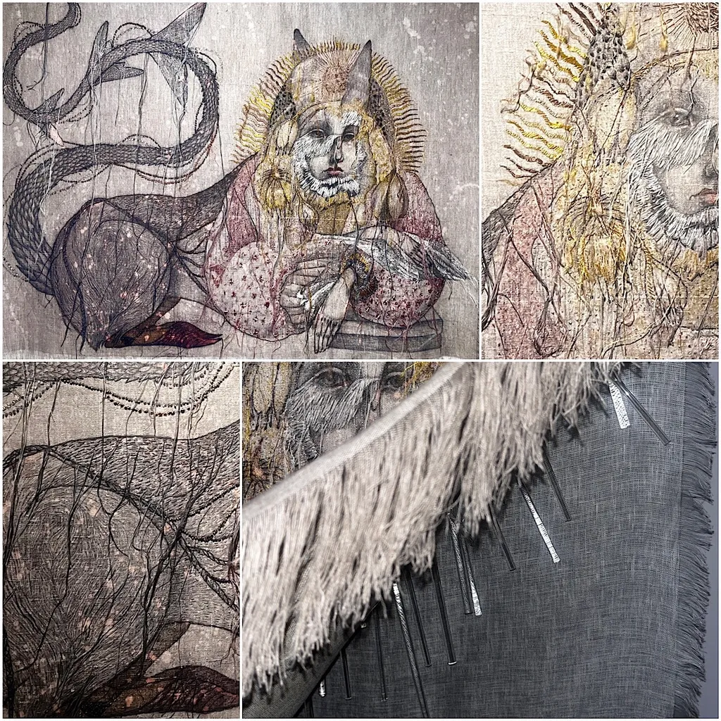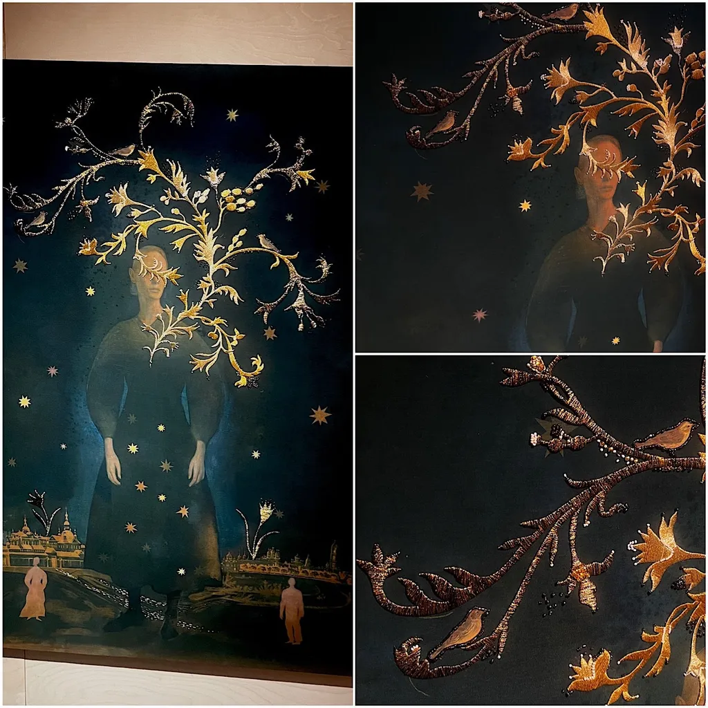 Елена Мазур соединила мотивы городецких росписи и резьбы, перенеся их на нехарактерный для этих промыслов материал — текстиль, с которым обычно работает художница. Это просто требует нереальных навыков и легкости руки, чтобы сделать. Просто посмотрите! Художница рекомендует читать композицию снизу вверх, осмысляя объекты через концептуальную связь движения, поддержки, призыва и цели.