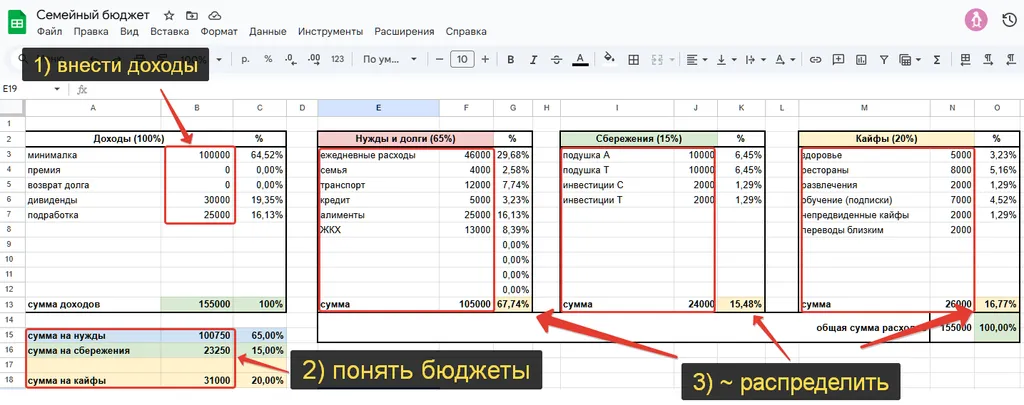 Формула автоматически посчитает нам суммы, которые можно будет потратить на нужды, цели и кайфы.