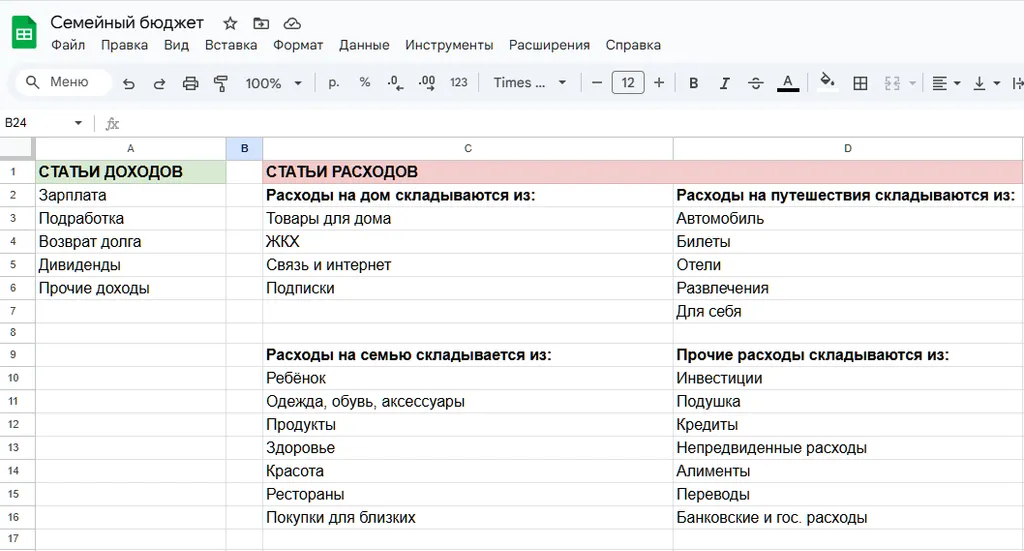 Этот лист нужен нам, чтобы не запутаться в категориях, когда мы вносим свои траты и приходы. Все описанные здесь категории на 100% идентичны строкам на листе «2_Бюджет» и такая строгость нужна, чтобы формулы работали.