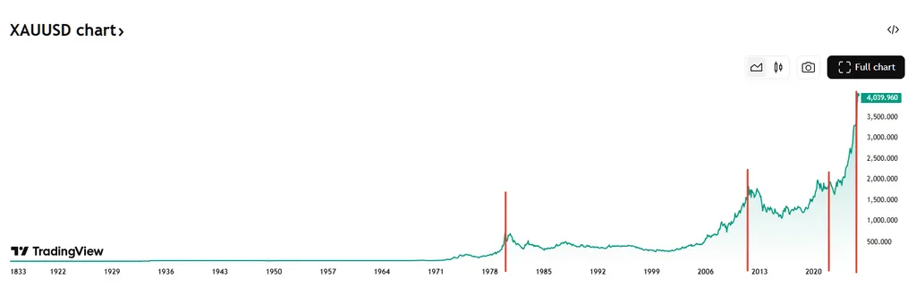 Вернемся к графику цены золота, на котором видны характерные «пики» стоимости в 80х годах, далее постепенный рост с 2008 по 2012, потом в ковид, далее СВО (казалось бы, причем тут США?) и текущий «туземун»