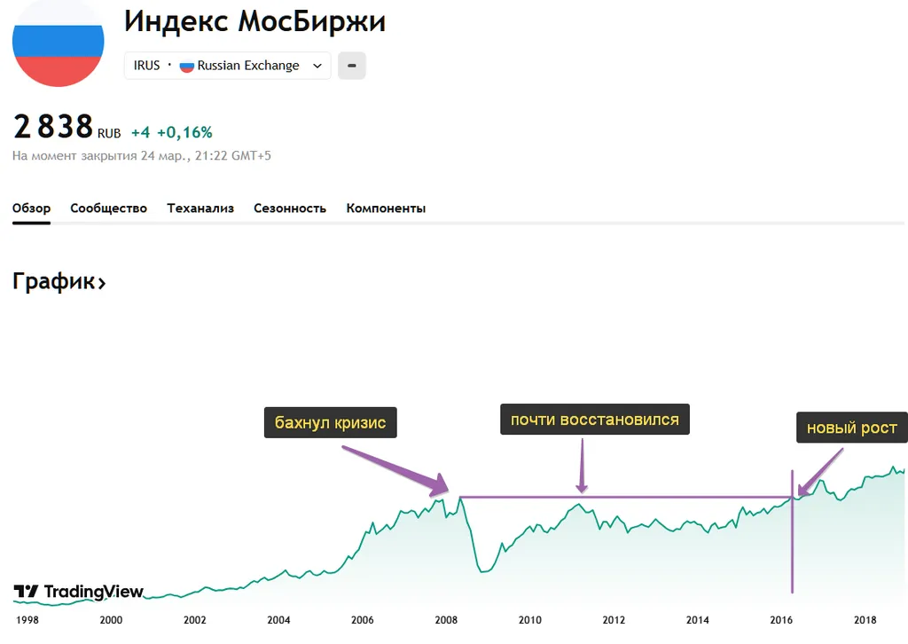 Как уже писал выше, на длинном горизонте среди кризисов и «застоев», в себя она приходит сильно быстрее недвижки + в меру диверсифицированный портфель может радовать дивидендами куда более стабильно, нежели рандомная хата.