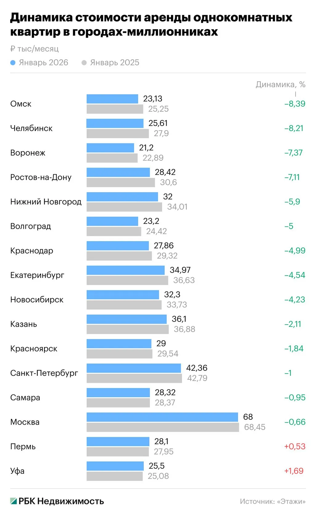 Стоимость аренды за последний год упала в 14 городах-миллионниках из 16.