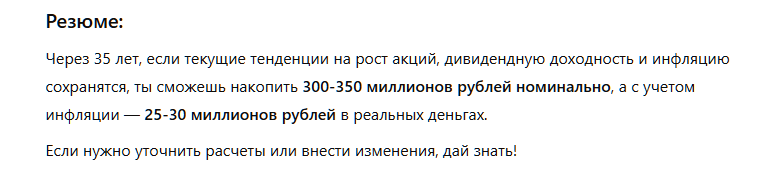 Честно, я пытался помучить ChatGPT и DeepSeek этими вопросами, но разумных ответов получить не смог. В среднем, говорят, через 35 лет миллионов 300-350 у тебя будет, что в пересчете на «чистые» — около 30 миллионов рублей.