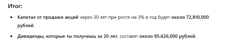 Мало того, что наши 30 млн превратятся в 72 млн (это с учетом инфляции!), так ещё и дивиденды также будут расти из года в год и тоже будут обгонять инфляцию. Через 30 лет они вырастут до 365 тысяч рублей в месяц.