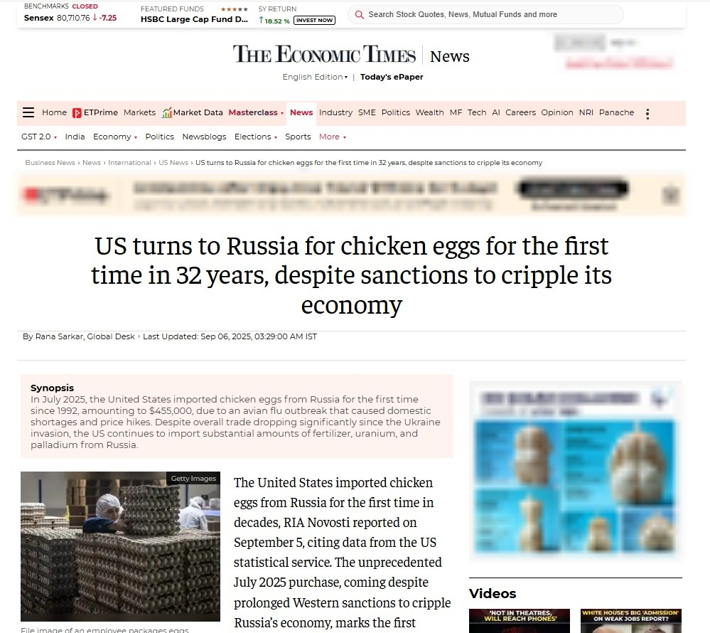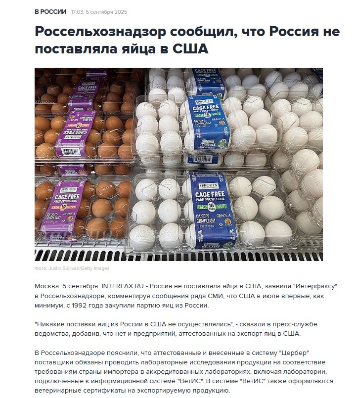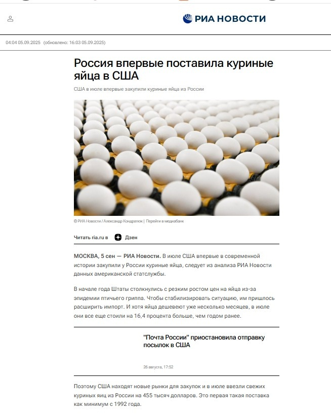 Например, The Economic Times (индийская ежедневная газета на английском языке) написала следующее: «В июле 2025 года Соединенные Штаты впервые с 1992 года импортировали куриные яйца из России на сумму 455 000 долларов».