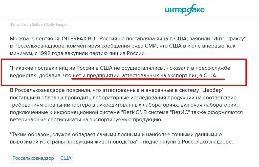 Потому эту новость подхватили и другие СМИ, в том числе и зарубежные, написав о том, что Россия начала поставки яиц в США.