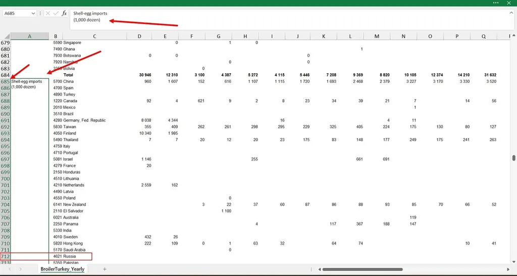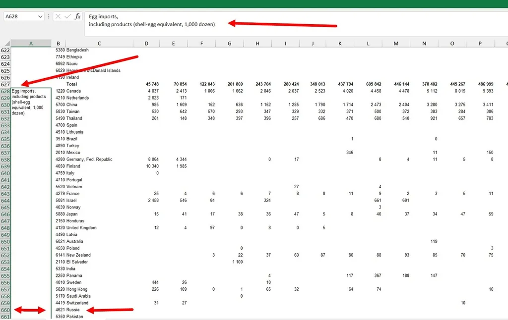 Есть другой вариант, вдруг под «яйцами» имеется в виду что-то другое? Например, яичные продукты (меланж, яичный порошок, пастеризованная масса)? Как вариант, может быть. Но это легко проверить. В таблице есть этот пункт: Egg imports, including products (shell-egg equivalent, 1,000 dozen). Это и есть та самая более широкая категория, сюда входят и яйца в скорлупе, и яичные продукты, и, главное, все продукты пересчитываются в эквивалент дюжин яиц в скорлупе.