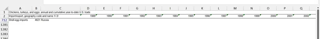 Тут много разделов, но нас интересует именно раздел с яйцами, называется он «Shell-egg imports (1,000 dozen)» — это «Импорт яиц в скорлупе (1000 дюжин)»: