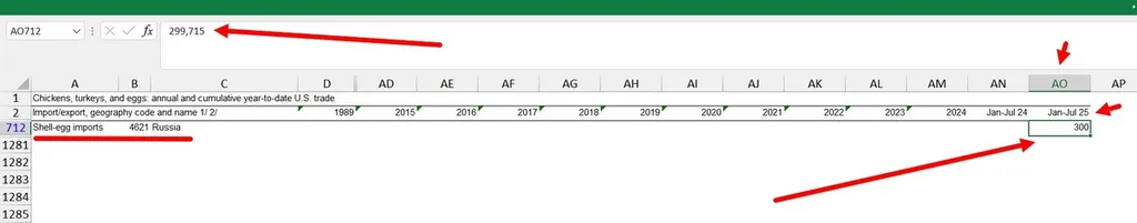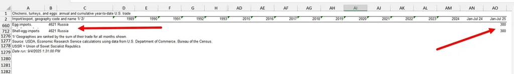 Теперь несложно выяснить, когда именно был осуществлен импорт яиц из России в США. Но в таблице показан диапазон январь–июль, потому непонятно, когда именно были эти поставки. Может, в январе? Но, как я упоминал выше, отчет Экономической исследовательской службы Министерства сельского хозяйства США от 17 июля 2025 года, там фиксировался резкий рост импорта яиц в первом полугодии по май включительно. Россия там никак не фигурирует.