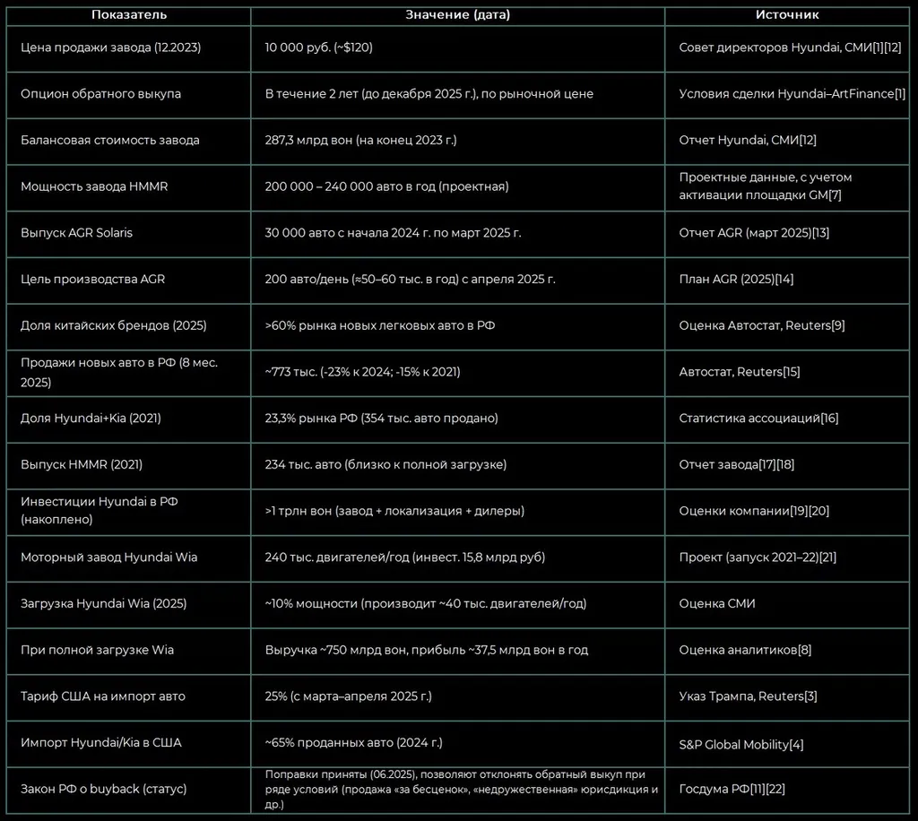 [8] — Статья корейского издания: отмечается, что Hyundai продала завод в 2023 с правом выкупа до конца 2025; при окончании войны РФ–США вероятно возвращение. Указано, что завод Hyundai Wia в РФ при полной загрузке может дать 750 млрд вон выручки и 37,5 млрд вон прибыли (5% маржа).