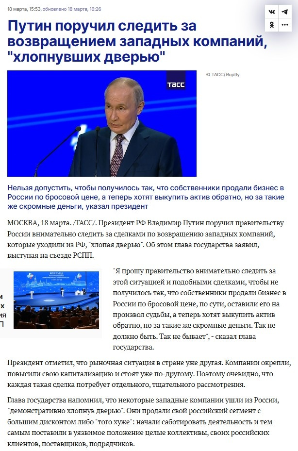 Российское руководство заняло двойственную позицию. С одной стороны, в заявлениях высших лиц прослеживается линия на наказание компаний, «сбежавших» из России. Владимир Путин 18 марта 2025 г. прямо сказал: «Вернувшимся западным компаниям, которые хлопнули дверью, не будет легко»[10]. Он подчеркнул, что те, кто ушел под давлением политической конъюнктуры и продал активы за копейки, не должны получить их обратно за ту же символическую сумму[10][58]. Если нишу ушедшей компании уже заняли отечественные игроки, то «поезд ушел» — дал понять Путин[59].
